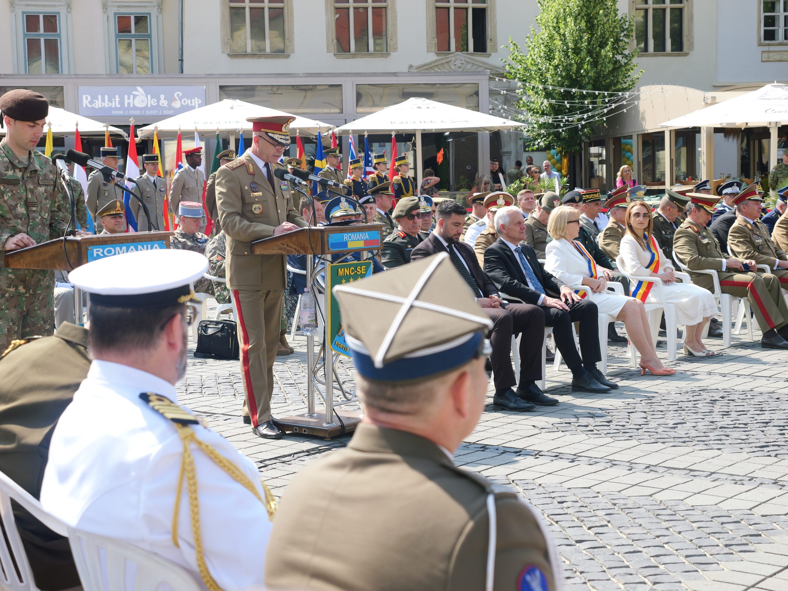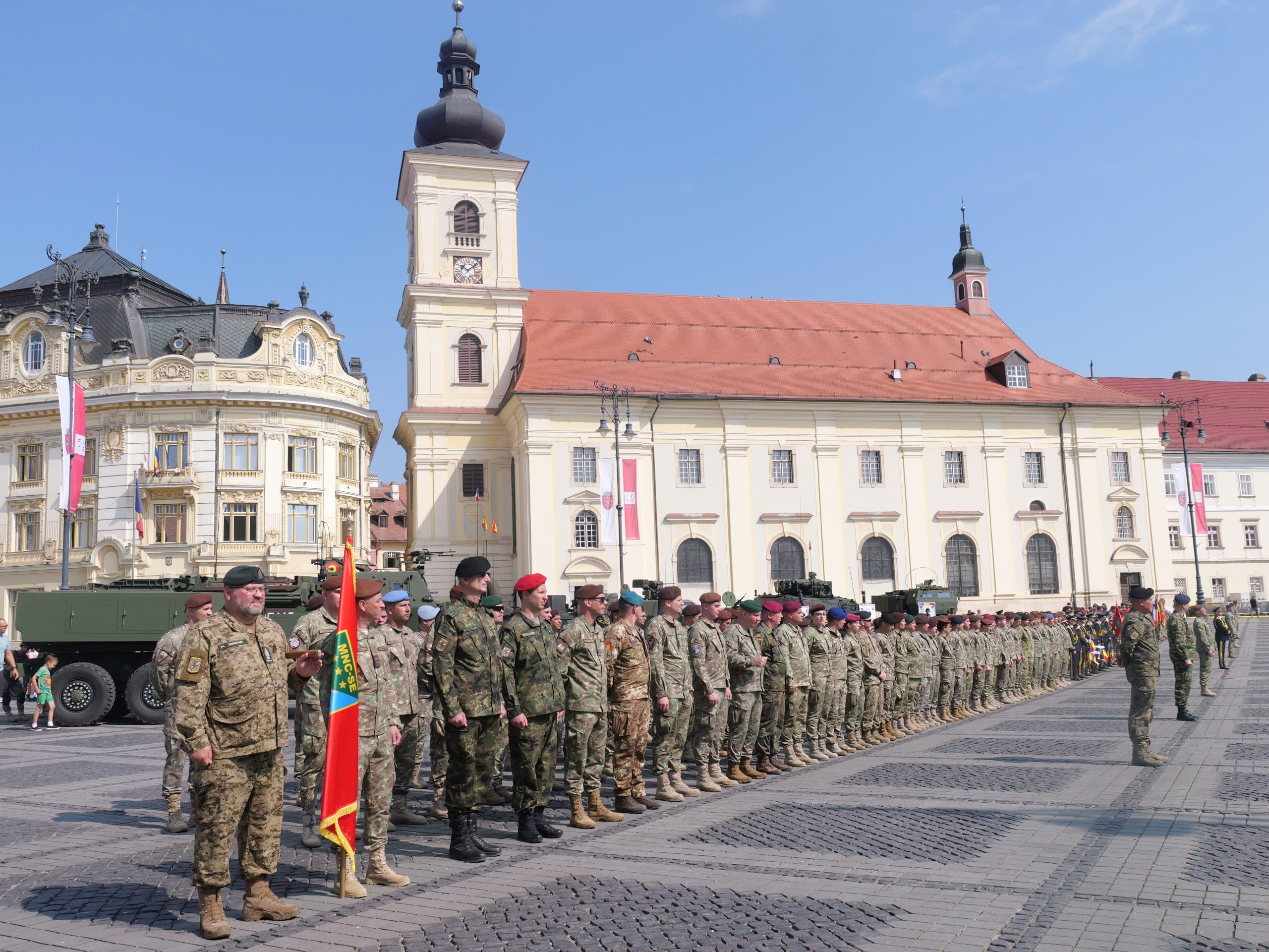 On 18 June, the official anniversary day of Headquarters Multinational Corps South-East was celebrated through a festive ceremony held in Piața Mare of Sibiu. The event brought together personnel of the unit, representatives of NATO’s Force Structure and of the Romanian Ministry of National Defence, military from the subordinate units and partner military structures, local and national officials, as well as members of the Sibiu community, all in a warm and festive atmosphere.